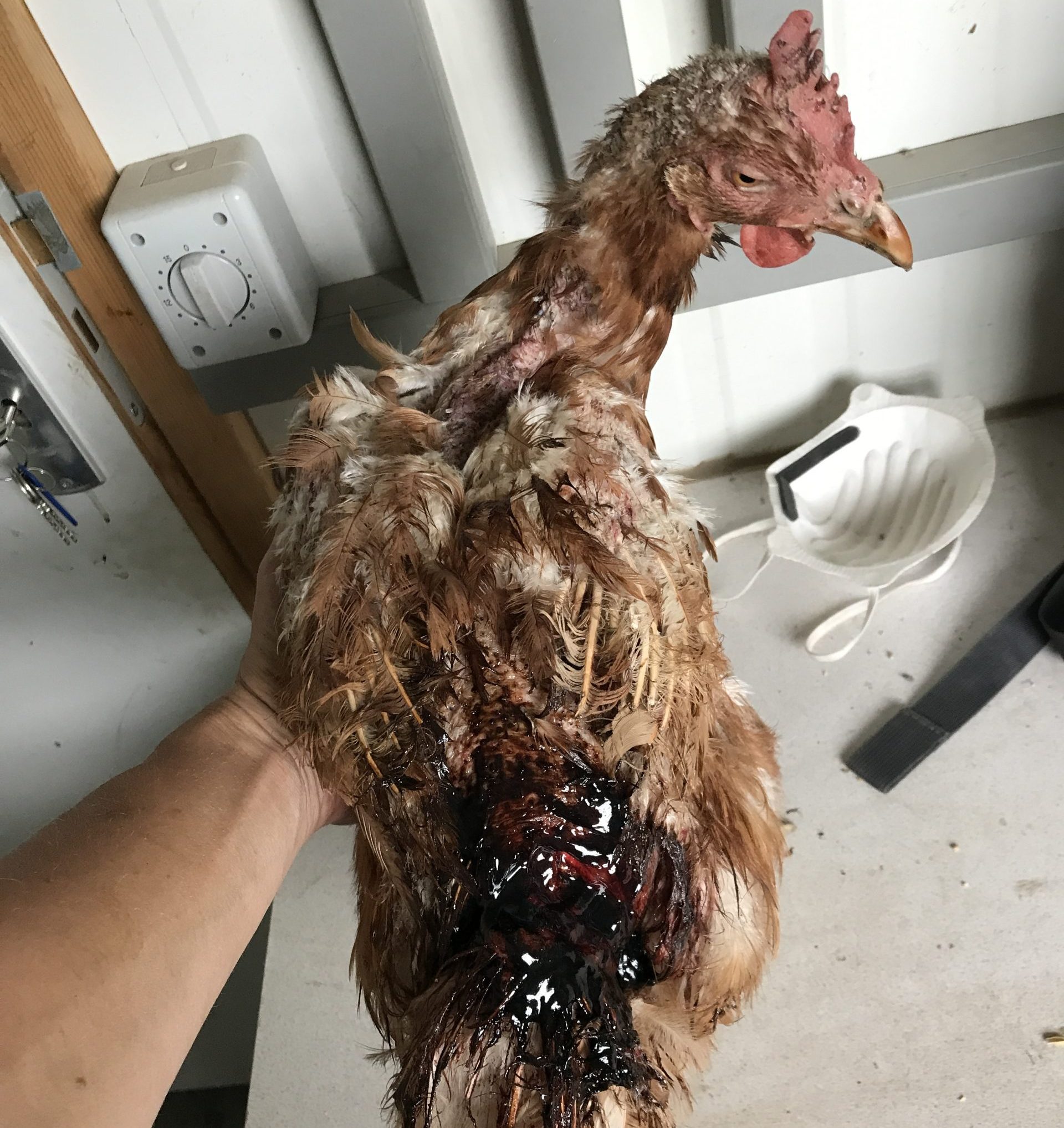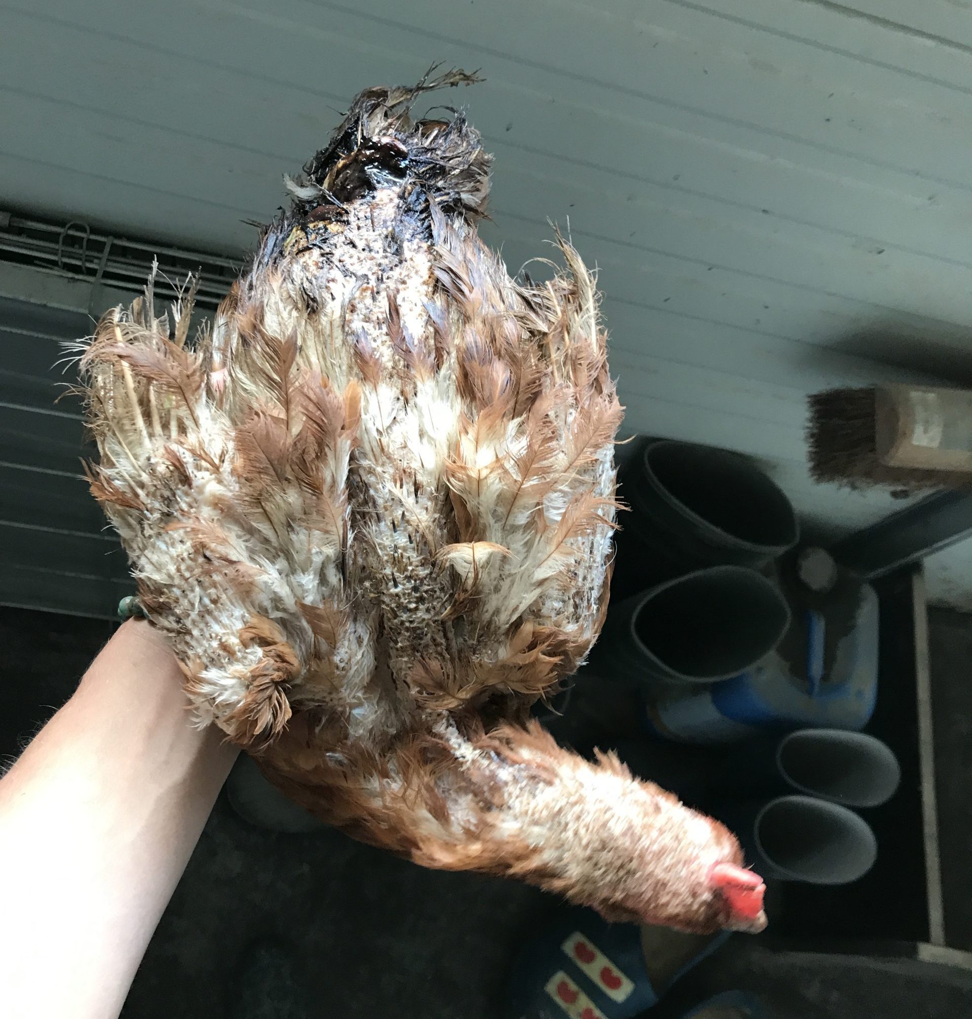 De andere hennen pikten in mijn stuitje en er was veel bloed. Dan werd ik ingesmeerd met zwarte vieze smeer en moest ik een apart hok in. Daar was het fijner, ook als was het heel klein. Als mijn wond weer was geheeld, moest ik daar weer uit. Toch werd ik steeds weer aangevallen en mijn rug deed steeds meer pijn.