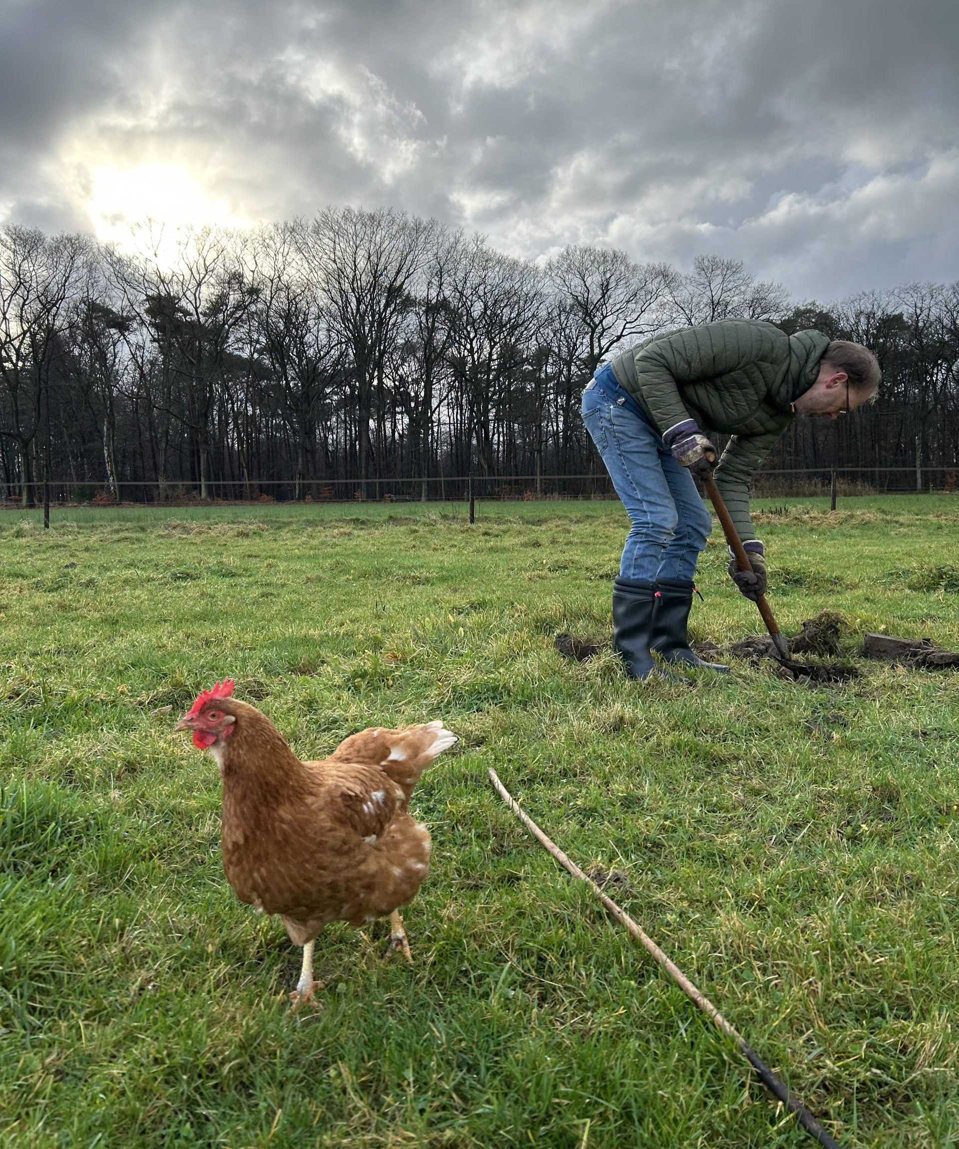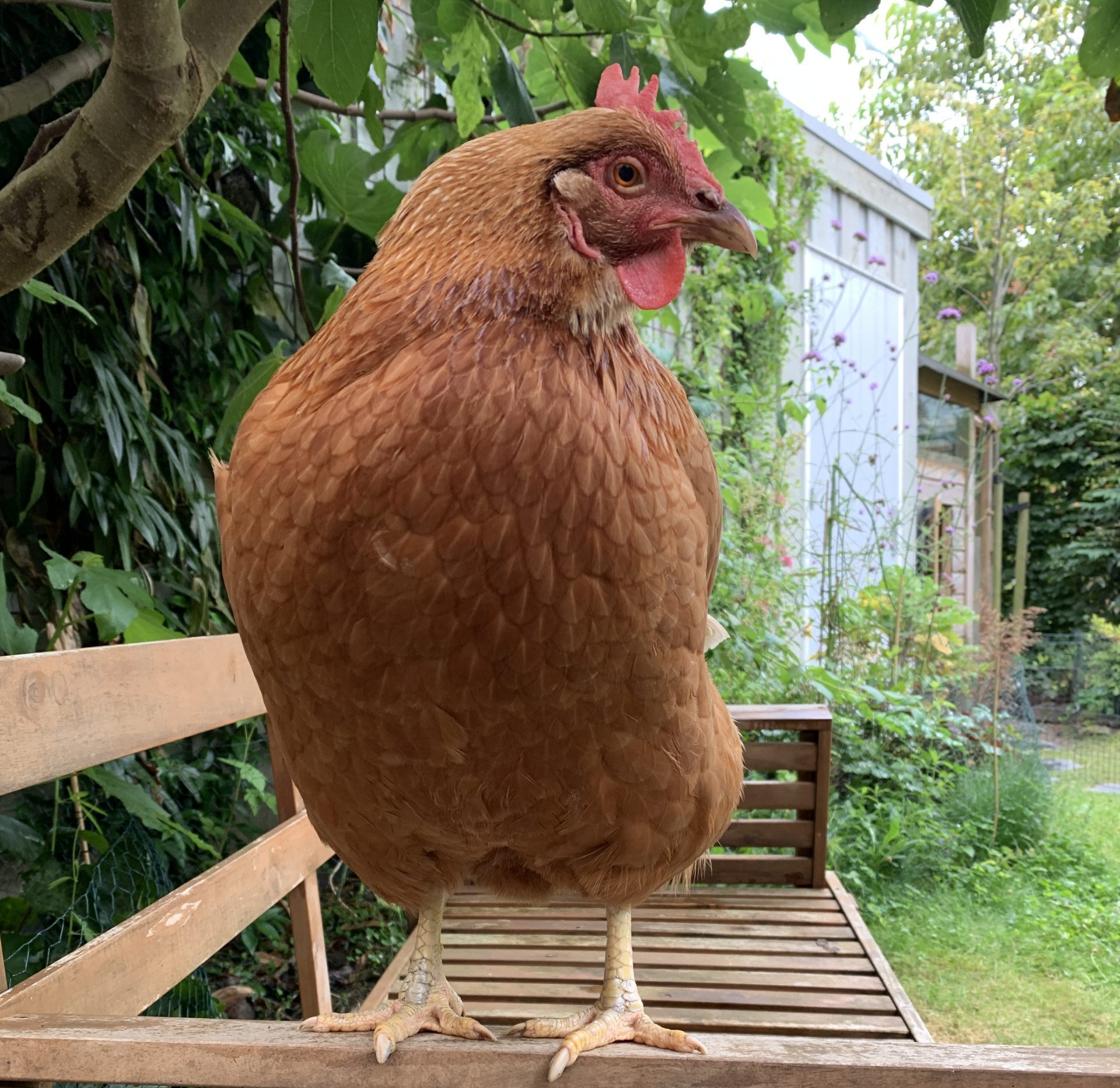 Ik ben inmiddels de laatst levende van de 1e groep leghennen van de Herenboerderij De Vlinderstrik. Ik ben de oudste in mijn groep en ik voel me goed. Ik kan mijn staart niet hoog dragen omdat deze spieren zijn weggepikt, maar daar heb ik nu geen last meer van. We zijn verhuisd naar een plek met een groot weiland. Als mensen op het weiland zijn, roep ik soms dat ik mee wil. Dan ga ik mee op de kruiwagen. Samen met de hond hou ik dan onze mensen in de gaten. Soms krijg ik last van het eieren leggen. Dan krijg ik een scherp ding tussen mijn vleugels, dan stop ik met leggen.