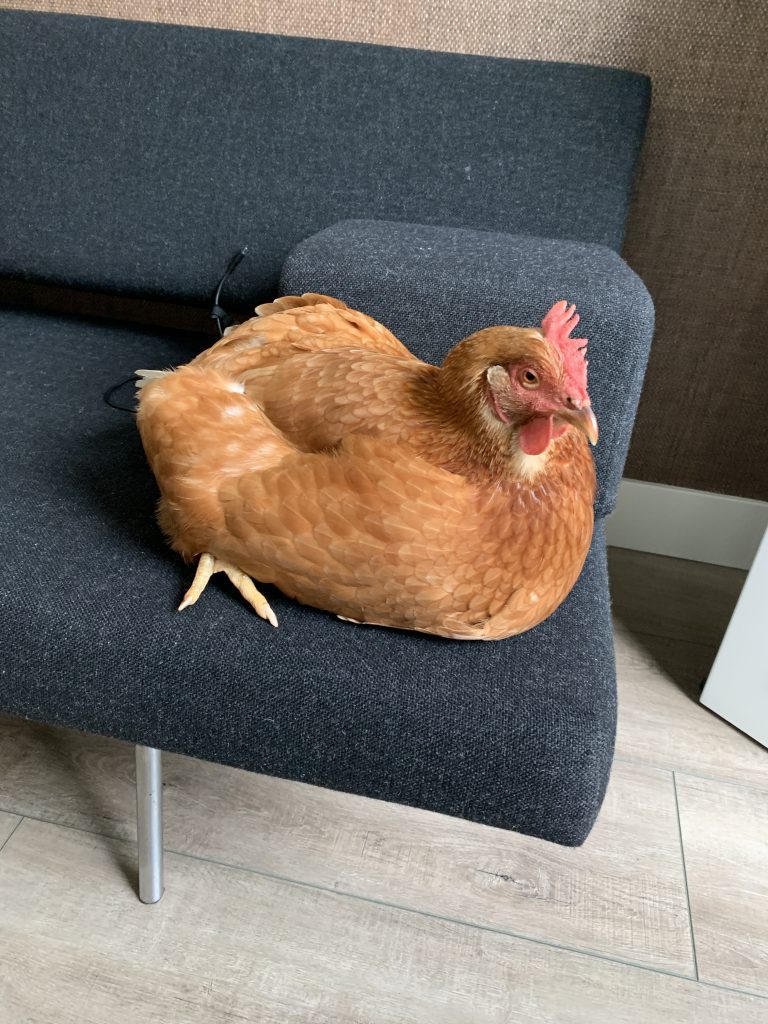 Ik ben Aretha, geboren als een biologische hybride leghen, op 23 maart 2020. Toen ik 16 weken oud was, werden we met z’n allen in kratten gestopt en weggereden. Ik kwam terecht in een klein hok samen met 245 andere hennen en 3 hanen. De slaapstokken hingen heel hoog en het water ook. Mijn lichaam begon eieren te leggen. Ik wilde veel eten en vooral veel water drinken. Er kwam maar weinig water uit de pipetjes, als je ze aanraakte. Wij leerden met z’n allen om eieren te leggen op de rubberen matten achter rode flappen. Het was daar heel druk omdat iedereen tegelijk moet leggen. Na een paar weken gingen er twee luiken in ons hok open. Door de luiken konden we naar buiten lopen, in een bosje met hoge bomen, dat was erg leuk. Soms vloog er een roofvogel op ons af, die heeft een paar hennen gegrepen. Dat was heel naar.