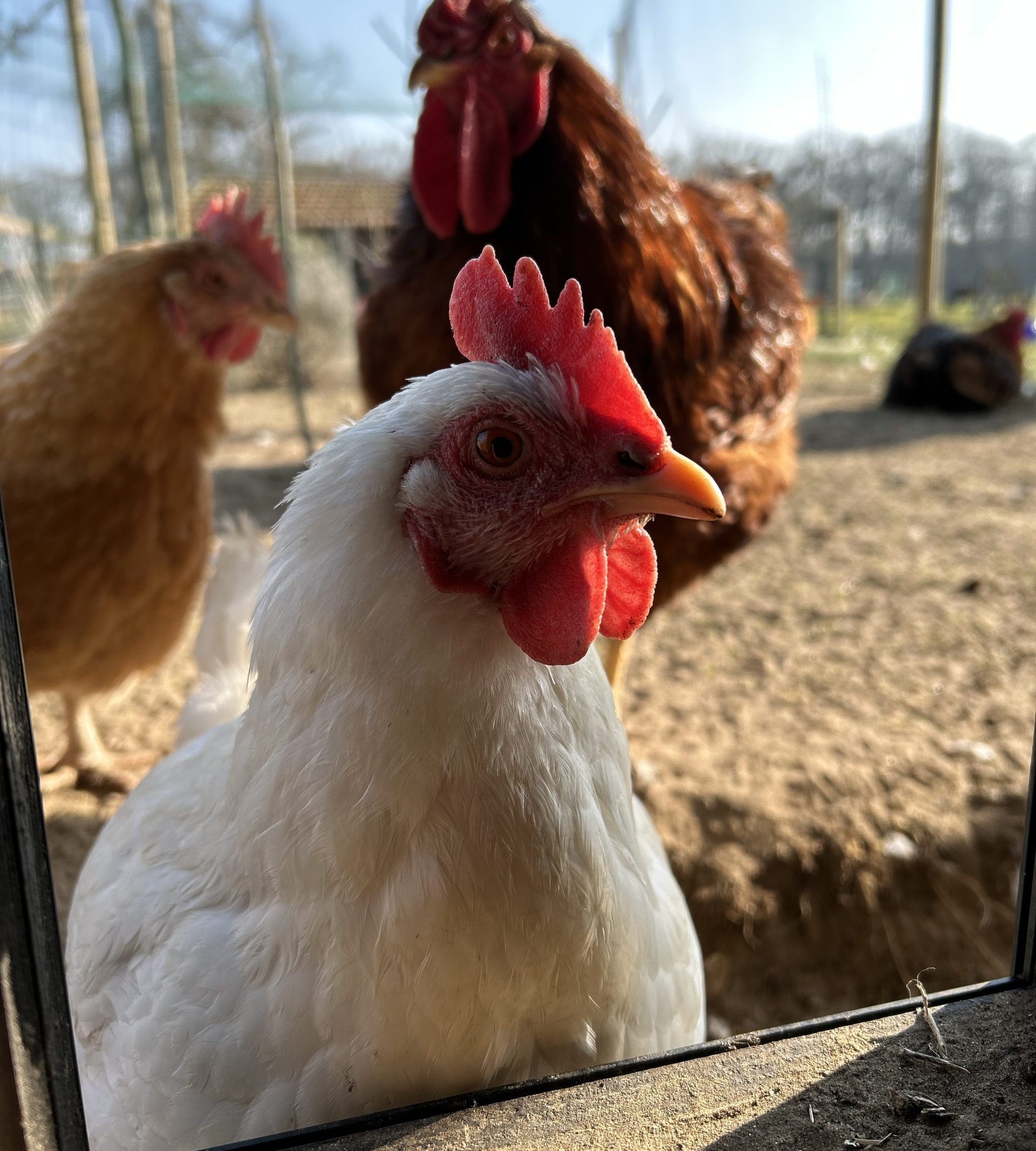 Ik ben Ira, geboren als ouderdier, op 14 januari 2023. We leefden met heel veel kuikens bij elkaar. Toen we wat ouder werden en onze lichamen zich begonnen te ontwikkelen, werden we in kratten op een grote vrachtwagen gereden naar een andere stal.