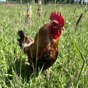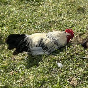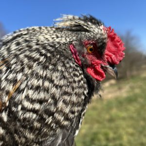 Ik ben Sjef, een haan. Ik ben een geboren leider en ik kan razendsnel rennen en heel hoog springen. Ik had een thuis en hennen om voor te zorgen. we werden ergens heen gebracht. Daar werden mijn hennen doodgemaakt door loslopende honden. Ik kon daar helaas niets tegen doen. Ik sloot me aan bij een groepje heel jonge hanen die hier ook opeens waren. Soms was het gevaarlijk en er was geen voedsel, maar we overleefden. We werden naar een veilige plek gebracht, hier zijn veel andere hanen. Het is hier heel prettig, maar ik wil heel graag weer leven met een groepje lieve hennen.