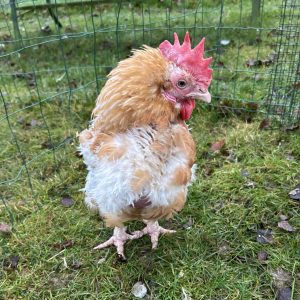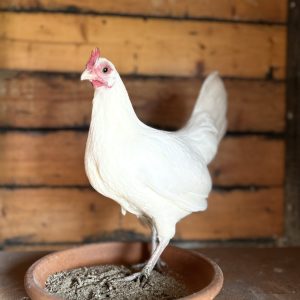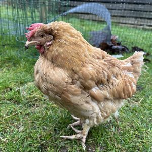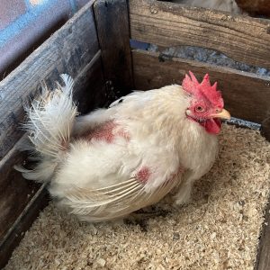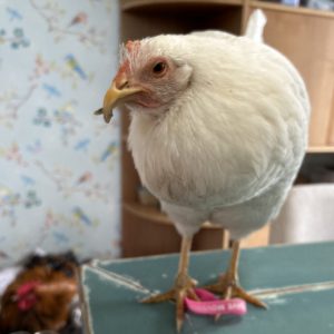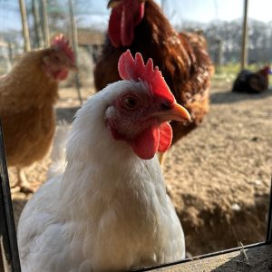 Hoi, ik ben Amy. Ik ben geboren als ouderdier. We leefden met velen in de stal, het was vies en er was te weinig ruimte. Sommige dieren kwamen vast te zitten, tussen en onder metalen dingen, dan was er veel gekrijs en geschreeuw. Ik kwam ook vast te zitten. Ik heb me weten te bevrijden, maar kon niet meer goed lopen. Toen werd ik uit de stal gehaald. Als de andere kippen uit onze stal ons nu eens konden zien: we hebben schone nieuwe veren, we hebben altijd vers water en altijd lekkers te eten. We kunnen stofbaden in het schone zand en liggen op het zachte gras in de schaduw van een boom.