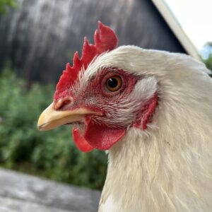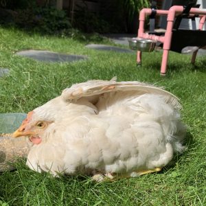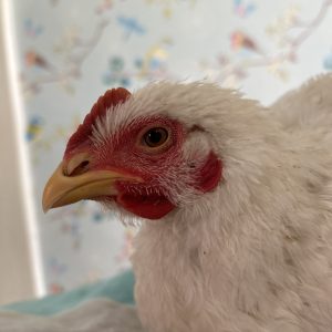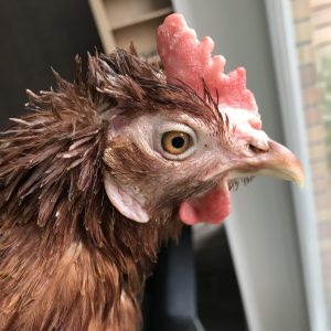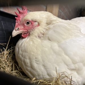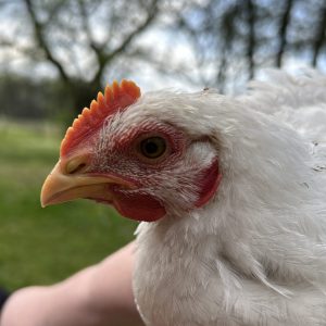 Ik ben Cloe. Ik ben geboren als vleeskuiken, op 1 maart 2025. Ik heb altijd honger en ik ben wat dik. Met 14 weken woog ik al 6 kilo. Maar ik vind het leuk om hier te scharrelen en struinen met mijn vrienden. We vinden elkaars gezelschap fijn en we vinden de mensen die hier komen ook leuk.
